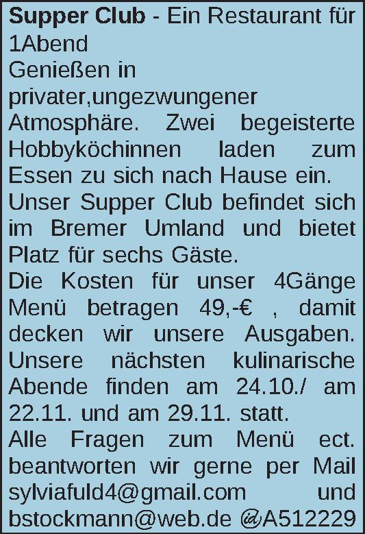 Genießen in privater ungezwungener Atmosphäre. Zwei begeisterte Hobbyköchinnen laden zum Essen zu sich nach Hause ein.Unser Supper Club befindet sich im Bremer Umland und bietet Platz für sechs Gäste.