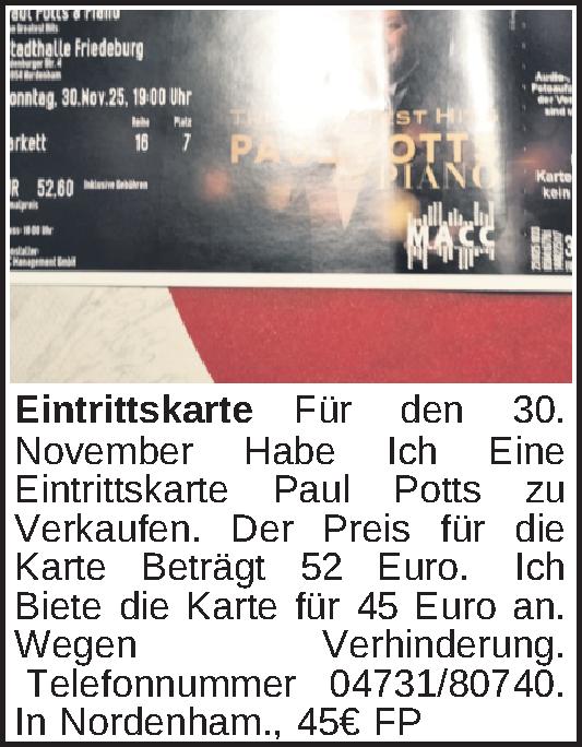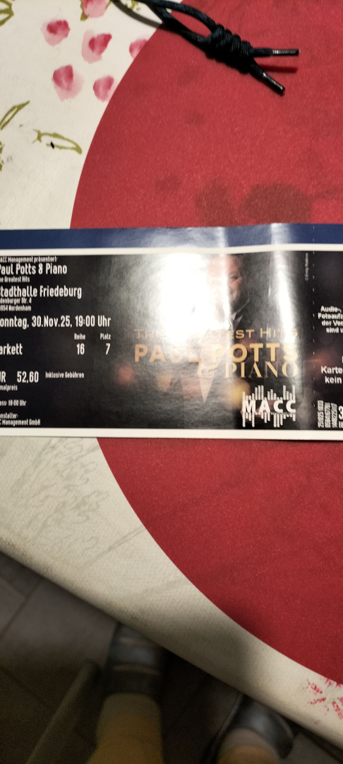 Für den 30. November Habe Ich Eine Eintrittskarte Paul Potts zu Verkaufen.Der Preis für die Karte Beträgt 52 Euro. Ich Biete die Karte für 45 Euro an.