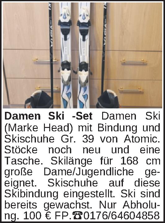 Damen Ski (Marke Head) mit Bindung und Skischuhe Gr. 39 von Atomic. Stöcke noch neu und eine Tasche. Skilänge für 168 cm große Dame/Jugendliche geeignet. Skischuhe auf diese Skibindung eingestellt. Ski sind bereits gewachst.Nur Abholung.