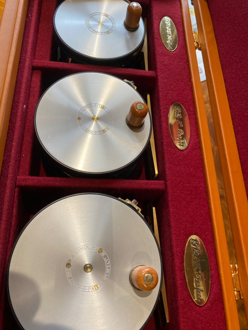 Absolut atemberaubendes, neues Set aus 3 Hardy 1912 Perfect Salmon Rollen, Seriennummer 020, True LHW, komplett mit Lederetui, Schlüssel, Handschuhen, grünem Baumwollbeutel, Ersatz-Messingfüßen, Original-Herstellungszertifikat und -Broschüre sowie originalem Umkarton. Bitte sehen Sie sich alle Fotos an. Entspricht 750,- pro Rolle – ein Schnäppchen! Größen: 3 3/4 Zoll, 4 Zoll und 4 1/4 Zoll