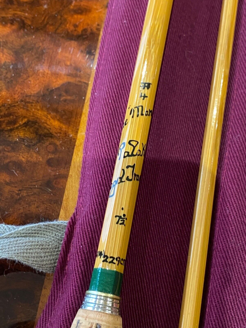 Atemberaubende Hardy Marvel 7 1/2 ft Palakona Bambus-Fliegenrute, dreiteilig mit zwei Spitzen, AFTM Gewicht 4, komplett mit originalem Hardy-Lederschutzrohr und Baumwollhülle. Siehe alle Fotos. Nur ausgestellt, sehr selten.Seriennummer IEQ 16414