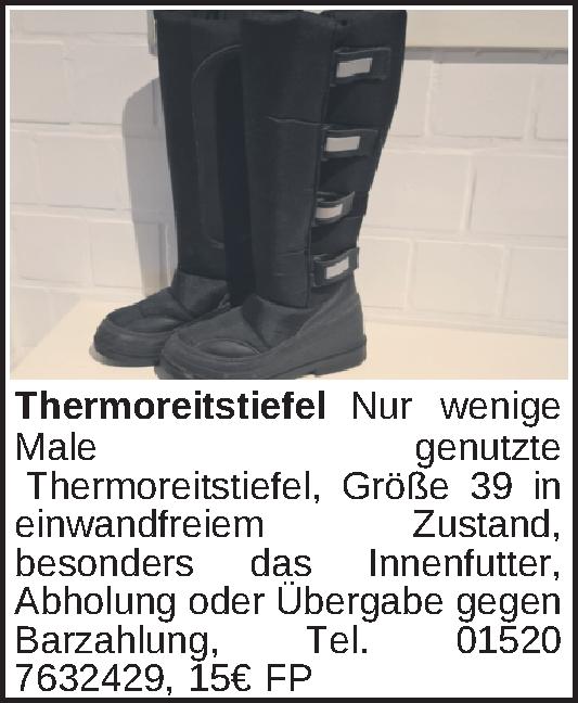 Nur wenige Male genutzte Thermoreitstiefel, Größe 39 in einwandfreiem Zustand, besonders das Innenfutter, Abholung oder Übergabe gegen Barzahlung, Tel. 01520 7632429Kontakt