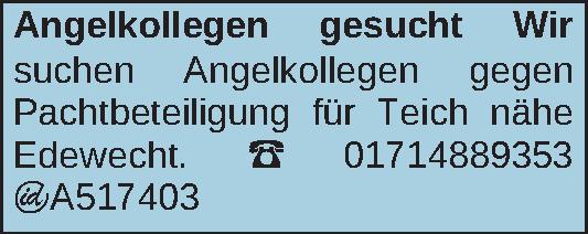 Wir suchen Angelkollegen gegen Pachtbeteiligung für Teich nähe Edewecht.Kontakt