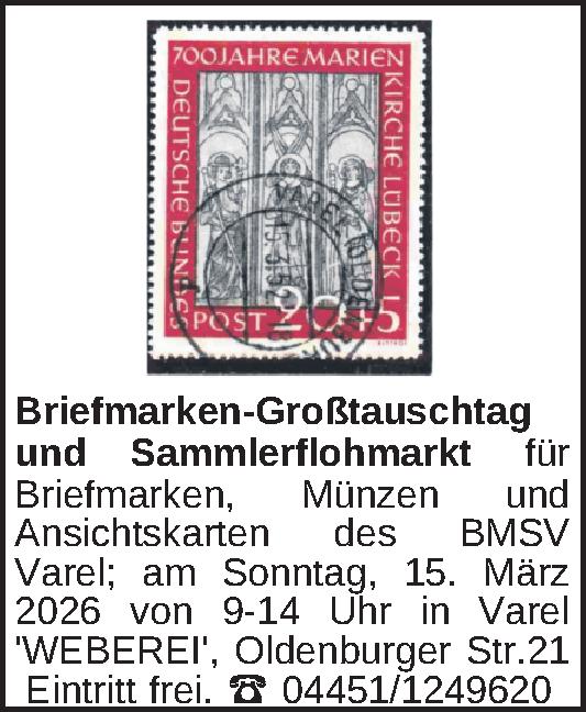 für Briefmarken, Münzen und Ansichtskarten des BMSV Varel; am Sonntag, 15. März 2026 von 9-14 Uhr in Varel ‚WEBEREI‘, Oldenburger Str.21 Eintritt frei.Tel.04451/1249620Kontakt