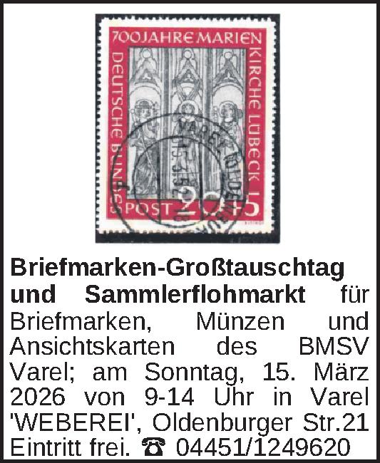 für Briefmarken, Münzen und Ansichtskarten des BMSV Varel; am Sonntag, 15. März 2026 von 9-14 Uhr in Varel ‚WEBEREI‘, Oldenburger Str.21 Eintritt frei.Tel.04451/1249620