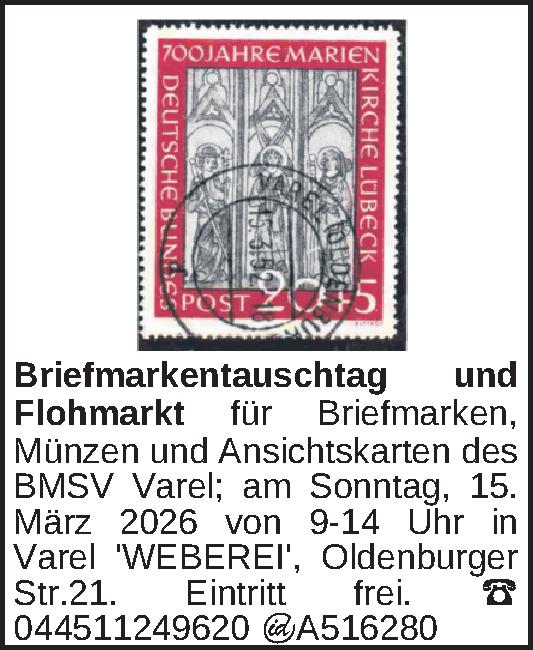 Sammlerflohmarkt für Briefmarken, Münzen und Ansichtskarten des BMSV Varel; am Sonntag, 15. März 2026 von 9-14 Uhr in Varel ‚WEBEREI‘, Oldenburger Str.21. Eintritt frei.Tel.04451/1249620