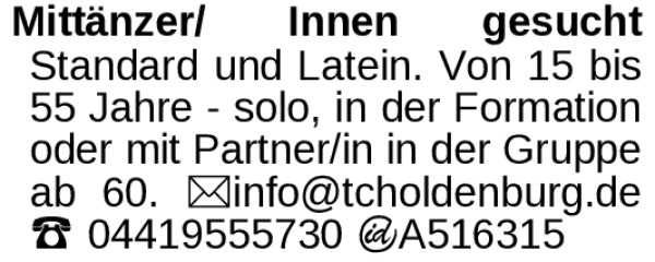 Standard und Latein. Von 15 bis 55 Jahren -solo, in der Formation oder mit Partner/in in der Gruppe ab 60. Tel 04419555730 oder info@tcholdenburg.de