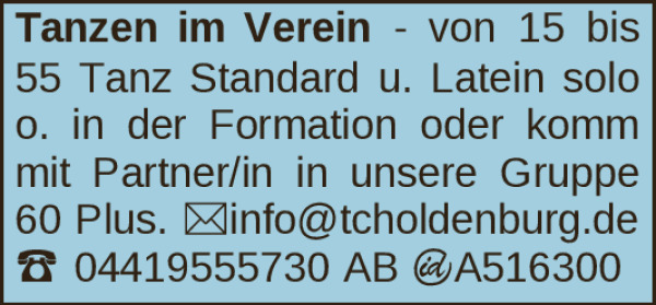 Von 15 bis 55 Tanz Standard und Latein solo oder in der Formation oder komm mit Partner/in in unsere Gruppe 60 Plus. info@tcholdenburg.deKontakt