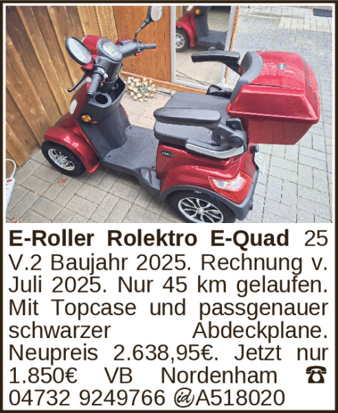 Baujahr 2025. Rechnung v. Juli 2025. Nur 45 km gelaufen. Mit Topcase und passgenauer schwarzer Abdeckplane. Neupreis 2.638,95€. Jetzt nur 1.850€ VB NordenhamKontakt