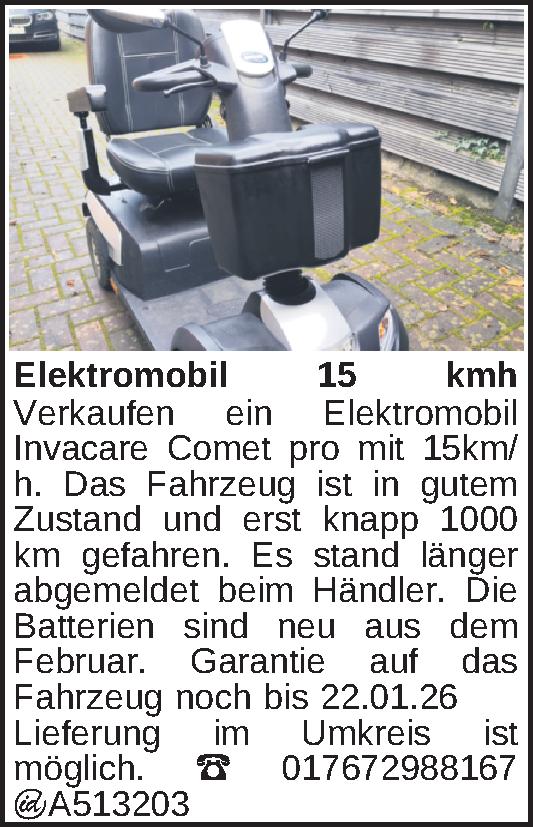 Verkaufen ein Elektromobil Invacare Comet pro mit 15km/h. Das Fahrzeug ist in gutem Zustand und erst knapp 1000 km gefahren. Es stand länger abgemeldet beim Händler. Die Batterien sind neu aus dem Februar. Garantie auf das Fahrzeug noch bis 22.01.26Kontakt