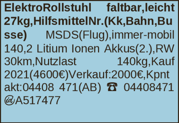 MSDS(Flug),immer-mobil 140,2 Litium Ionen Akkus(2.),RW 30km,Nutzlast 140kg,Kauf 2021(4600€)Verkauf:2000€,Kontakt