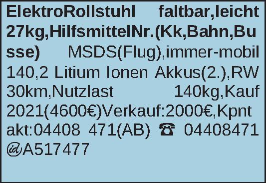 MSDS(Flug),immer-mobil 140,2 Litium Ionen Akkus(2.),RW 30km,Nutzlast 140kg,Kauf 2021(4600€)Verkauf:2000€,