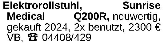 Elektrorollstuhl, Sunrise Medical Q200R, neuwertig, gekauft 2024, 2x benutzt, 2300 € VB, ‡ 04408/429Kontakt