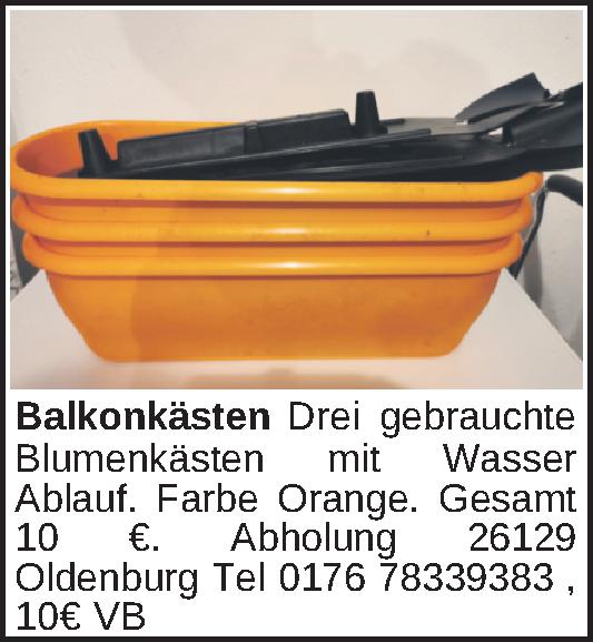 Drei gebrauchte Blumenkästen mit Wasser Ablauf. Farbe Orange. Gesamt 10 €. Abholung 26129 Oldenburg Tel 0176 78339383