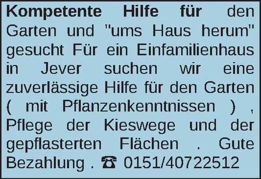 Für ein Einfamilienhaus in Jever suchen wir eine zuverlässige Hilfe für den Garten ( mit Pflanzenkenntnissen ) , Pflege der Kieswege und der gepflasterten Flächen gesucht . Gute Bezahlung .Kontakt