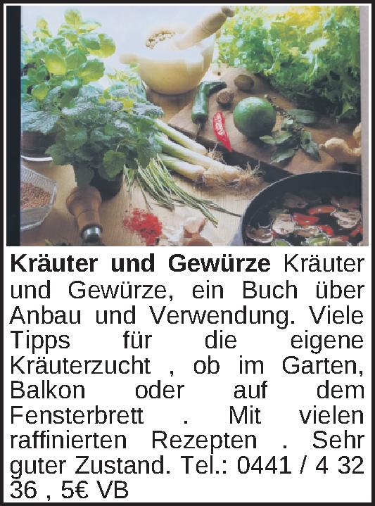 Kräuter und Gewürze, ein Buch über Anbau und Verwendung. Viele Tipps für die eigene Kräuterzucht , ob im Garten, Balkon oder auf dem Fensterbrett . Mit vielen raffinierten Rezepten . Sehr guter Zustand.Tel.: 0441 / 4 32 36