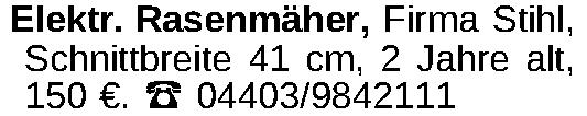 Elektr. Rasenmäher, Firma Stihl, Schnittbreite 41 cm, 2 Jahre alt, 150 €. ‡ 04403/9842111Kontakt
