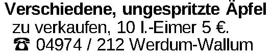 Verschiedene, ungespritzte Äpfel zu verkaufen, 10 l.-Eimer 5 €. ‡ 04974 / 212 Werdum-WallumKontakt