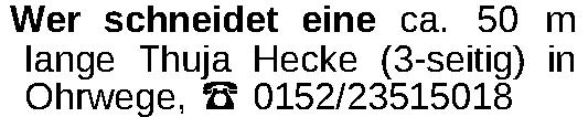 Wer schneidet eine ca. 50 m lange Thuja Hecke (3-seitig) in Ohrwege, ‡ 0152/23515018Kontakt