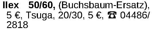 Ilex 50/60, (Buchsbaum-Ersatz), 5 €, Tsuga, 20/30, 5 €, 04486/ 2818