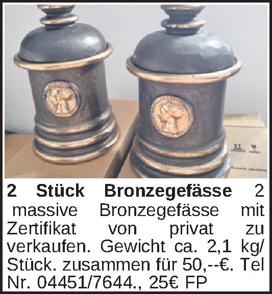 2 massive Bronzegefässe mit Zertifikat von privat zu verkaufen. Gewicht ca. 2,1 kg/Stück. zusammen für 50,--€.