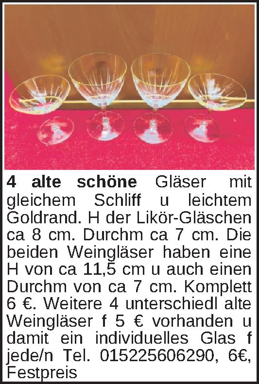 mit gleichem Schliff u leichtem Goldrand. H der Likör-Gläschen ca 8 cm. Durchm ca 7 cm. Die beiden Weingläser haben eine H von ca 11,5 cm u auch einen Durchm von ca 7 cm. Komplett 6 €. Weitere 4 unterschiedl alte Weingläser f 5 € vorhanden u damit eiKontakt