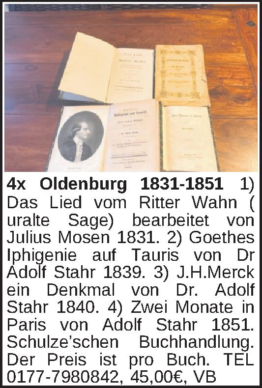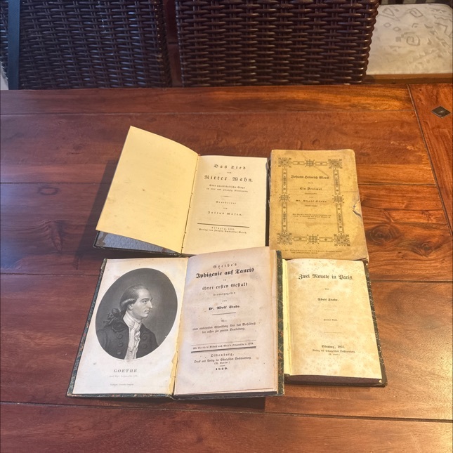 1) Das Lied vom Ritter Wahn ( uralte Sage) bearbeitet von Julius Mosen 1831. 2) Goethes Iphigenie auf Tauris von Dr Adolf Stahr 1839. 3) J.H.Merck ein Denkmal von Dr. Adolf Stahr 1840. 4) Zwei Monate in Paris von Adolf Stahr 1851. Schulze’schen Buchh