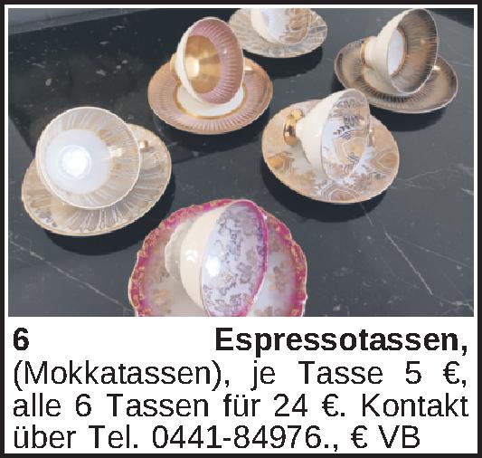 (Mokkatassen), je Tasse 5 €, alle 6 Tassen für 24 €. Kontakt über Tel. 0441-84976.Kontakt
