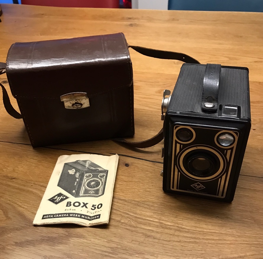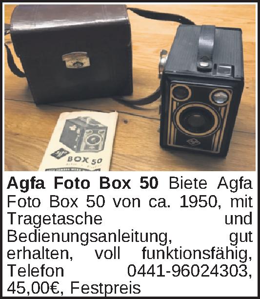Biete Agfa Foto Box 50 von ca. 1950, mit Tragetasche und Bedienungsanleitung, gut erhalten, voll funktionsfähig, Telefon 0441-96024303Kontakt