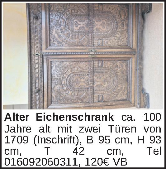 ca. 100 Jahre alt mit zwei Türen von 1709 (Inschrift), B 95 cm, H 93 cm, T 42 cm, Tel 016092060311Kontakt