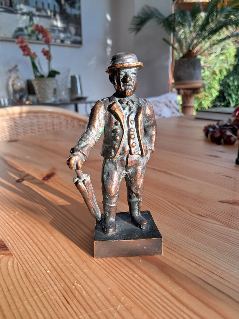 Kleine Bronzestatuette, Mann in Tracht mitRegenschirm, Höhe 15 cm, 750 Gramm