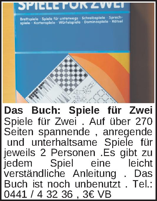 Spiele für Zwei . Auf über 270 Seiten spannende , anregende und unterhaltsame Spiele für jeweils 2 Personen .Es gibt zu jedem Spiel eine leicht verständliche Anleitung . Das Buch ist noch unbenutzt .Tel.: 0441 / 4 32 36