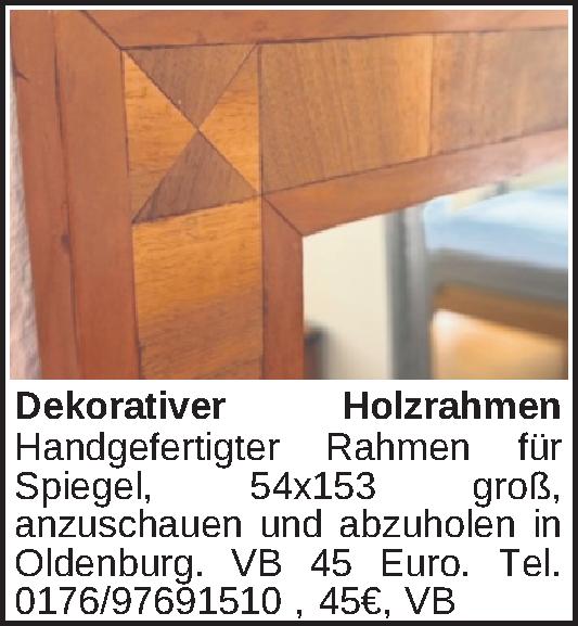 Handgefertigter Rahmen für Spiegel, 54x153 groß, anzuschauen und abzuholen in Oldenburg. VB 45 Euro. Tel. 0176/97691510Kontakt