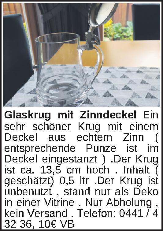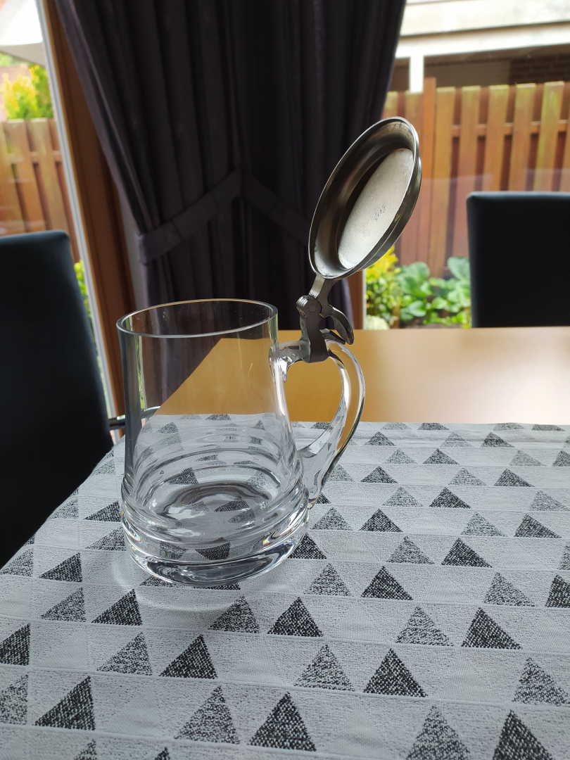 Anzeigentitel: Glaskrug mit Zinndeckel