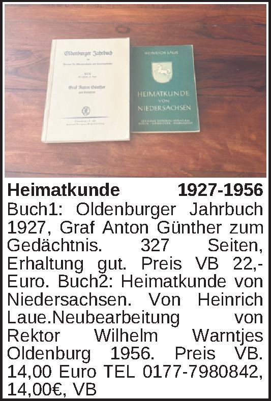 Buch1: Oldenburger Jahrbuch 1927, Graf Anton Günther zum Gedächtnis. 327 Seiten, Erhaltung gut. Preis VB 22,- Euro. Buch2: Heimatkunde von Niedersachsen. Von Heinrich Laue.Neubearbeitung von Rektor Wilhelm Warntjes Oldenburg 1956. Preis VB. 14,00 EurKontakt