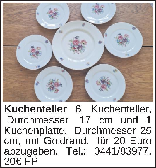 6 Kuchenteller, Durchmesser 17 cm und1 Kuchenplatte, Durchmesser 25 cm, mit Goldrand, für 20 Euro abzugeben.