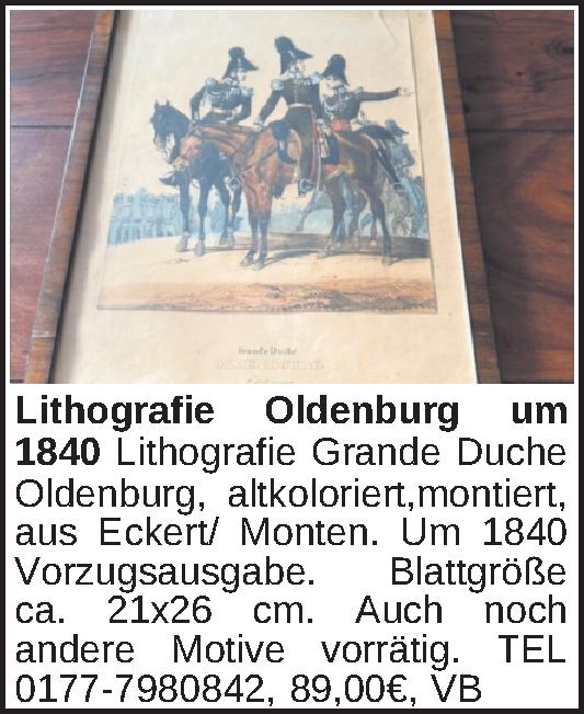 Lithografie Grande Duche Oldenburg, altkoloriert,montiert, aus Eckert/ Monten. Um 1840 Vorzugsausgabe. Blattgröße ca. 21x26 cm. Auch noch andere Motive vorrätig. TEL 0177-7980842Kontakt