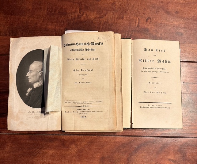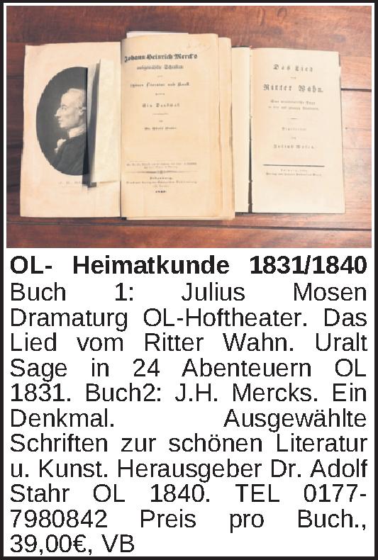 Buch 1: Julius Mosen Dramaturg OL-Hoftheater. Das Lied vom Ritter Wahn. Uralt Sage in 24 Abenteuern OL 1831. Buch2: J.H. Mercks. Ein Denkmal. Ausgewählte Schriften zur schönen Literatur u. Kunst. Herausgeber Dr. Adolf Stahr OL 1840. TEL 0177-7980842Kontakt