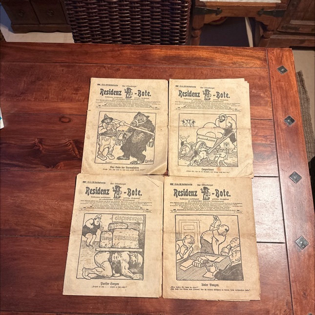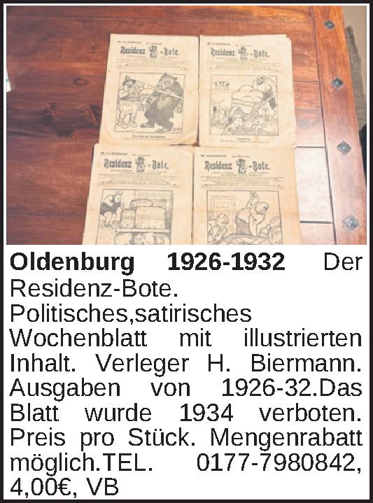 Der Residenz-Bote. Politisches,satirisches Wochenblatt mit illustrierten Inhalt. Verleger H. Biermann. Ausgaben von 1926-32.Das Blatt wurde 1934 verboten. Preis pro Stück. Mengenrabatt möglich.TEL. 0177-7980842Kontakt
