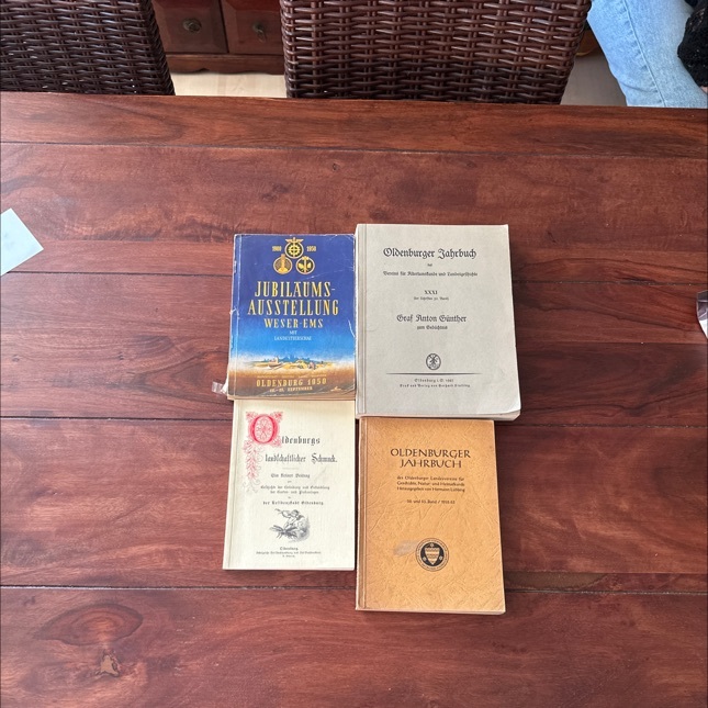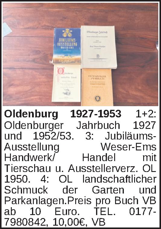 1+2: Oldenburger Jahrbuch 1927 und 1952/53. 3: Jubiläums-Ausstellung Weser-Ems Handwerk/ Handel mit Tierschau u. Ausstellerverz. OL 1950. 4: OL landschaftlicher Schmuck der Garten und Parkanlagen.Preis pro Buch VB ab 10 Euro. TEL. 0177-7980842Kontakt