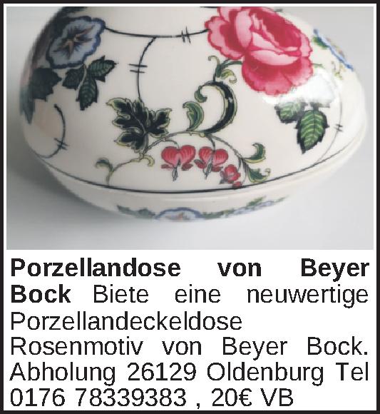 Biete eine neuwertige Porzellandeckeldose Rosenmotiv von Beyer Bock. Abholung 26129 Oldenburg Tel 0176 78339383