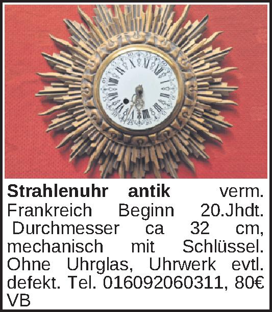 verm. Frankreich Beginn 20.Jhdt. Durchmesser ca 32 cm, mechanisch mit Schlüssel. Ohne Uhrglas, Uhrwerk evtl. defekt. Tel. 016092060311