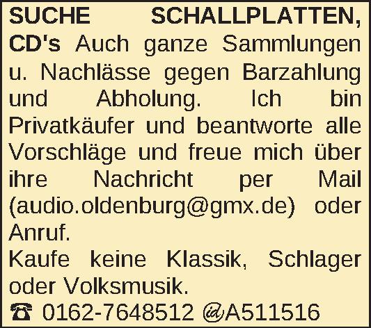 Auch ganze Sammlungen u. Nachlässe gegen Barzahlung und Abholung. Ich bin Privatkäufer und beantworte alle Vorschläge und freue mich über ihre Nachricht per Mail (audio.oldenburg@gmx.de) oder Anruf. Kaufe keine Klassik, Schlager oder Volksmusik.