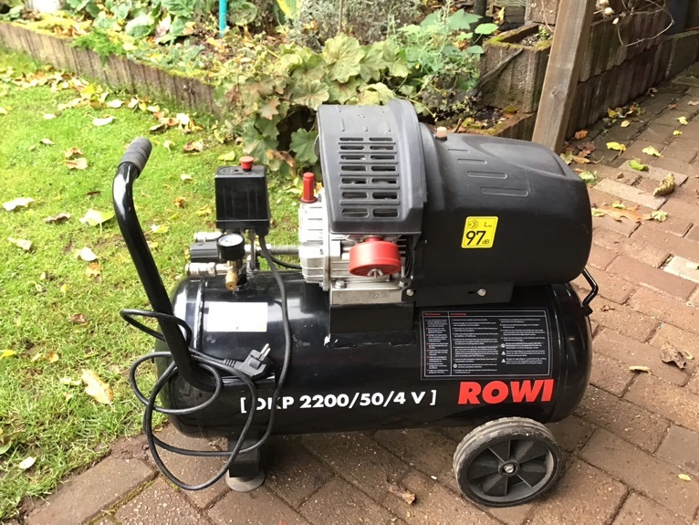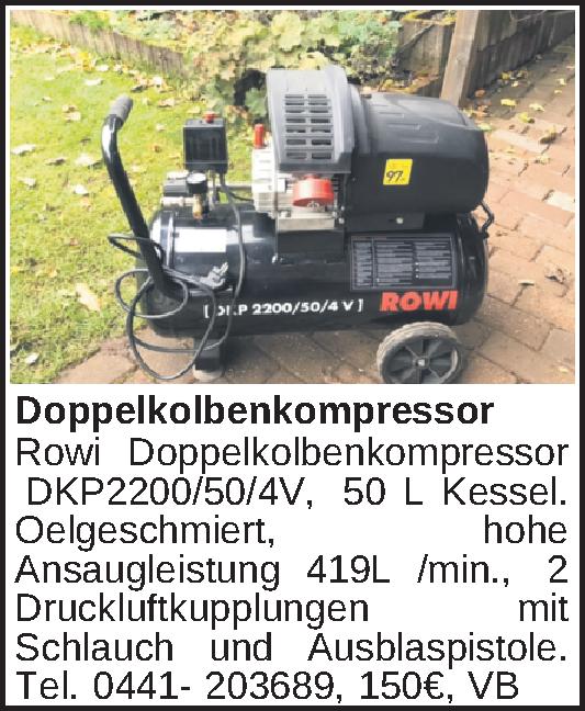 Rowi Doppelkolbenkompressor DKP2200/50/4V, 50 L Kessel. Oelgeschmiert, hohe Ansaugleistung 419L /min., 2 Druckluftkupplungen mit Schlauch und Ausblaspistole. Tel. 0441- 203689Kontakt