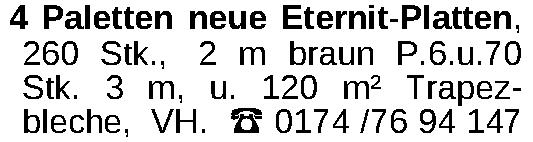4 Paletten neue Eternit-Platten, 260 Stk., 2 m braun P.6.u.70 Stk. 3 m, u. 120 m² Trapezbleche, VH. ‡ 0174 /76 94 147Kontakt