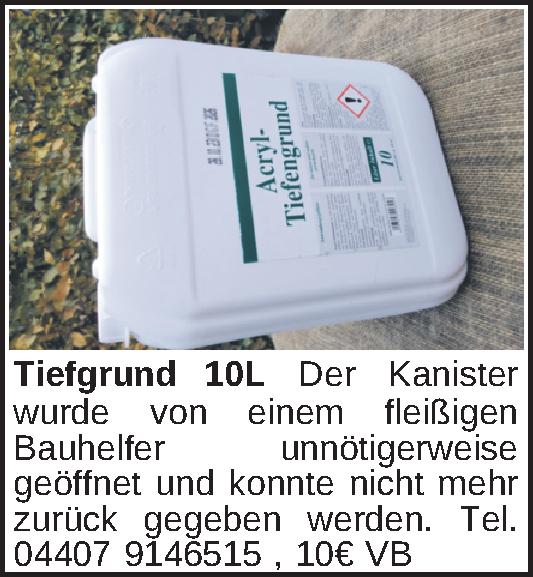 Der Kanister wurde von einem fleißigen Bauhelfer unnötigerweise geöffnet und konnte nicht mehr zurück gegeben werden. Tel. 04407 9146515