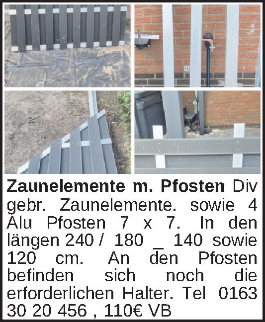 Div gebr. Zaunelemente. sowie 4 Alu Pfosten 7 x 7. In den längen 240 / 180 _ 140 sowie 120 cm. An den Pfosten befinden sich noch die erforderlichen Halter. Tel 0163 30 20 456Kontakt