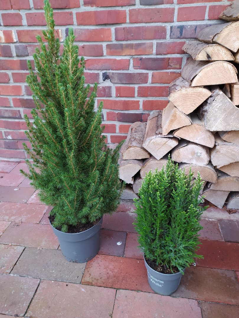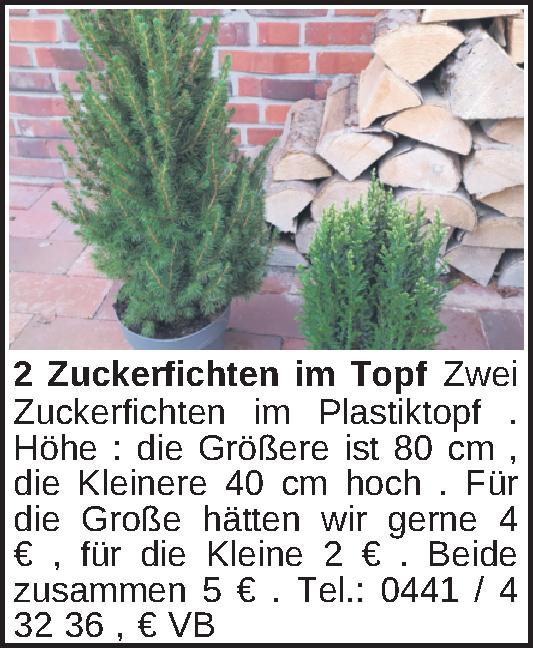 Zwei Zuckerfichten im Plastiktopf . Höhe : die Größere ist 80 cm , die Kleinere 40 cm hoch . Für die Große hätten wir gerne 4 € , für die Kleine 2 € . Beide zusammen 5 € .
