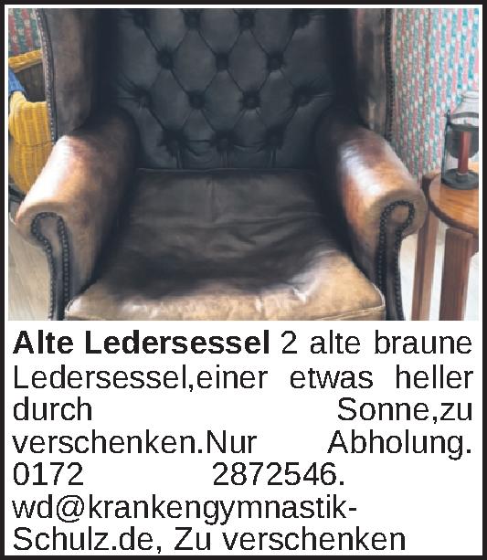 2 alte braune Ledersessel,einer etwas heller durch Sonne,zu verschenken.Nur Abholung. 0172 2872546. wd@krankengymnastik- Schulz.de