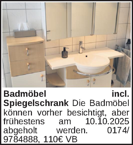 Die Badmöbel können vorher besichtigt, aber frühestens am 10.10.2025 abgeholt werden. 0174/9784888